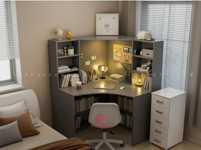Bàn học – bàn làm việc góc tường BH6842 được thiết kế theo dạng L ôm sát góc phòng, giúp tối ưu tối đa diện tích và mang lại không gian học tập – làm việc gọn gàng, hiện đại. Chất liệu gỗ MDF lõi xanh chống ẩm, bền chắc, chống cong vênh và dễ lau chùi. Hệ tủ giá sách hai bên và kệ dưới mặt bàn giúp sắp xếp sách vở, tài liệu tiện lợi. Khu vực bàn chính rộng rãi, đủ dùng cho laptop, sách và đồ trang trí. Thiết kế màu trung tính sang trọng, phù hợp phòng ngủ, phòng học hoặc phòng làm việc nhỏ.