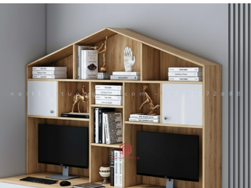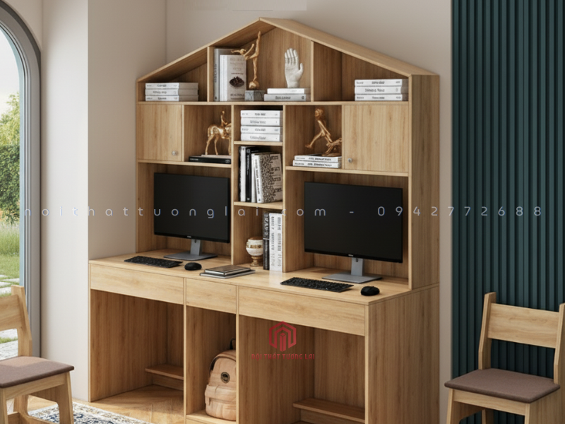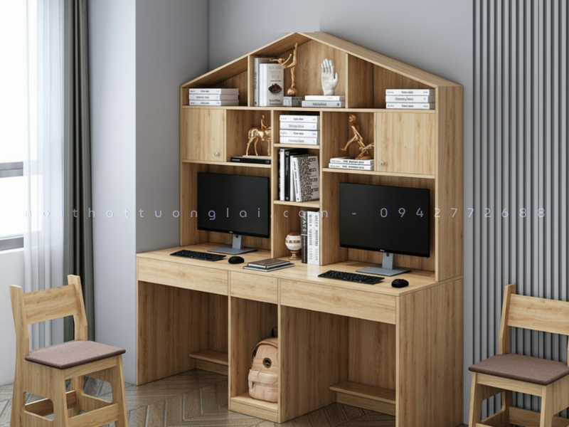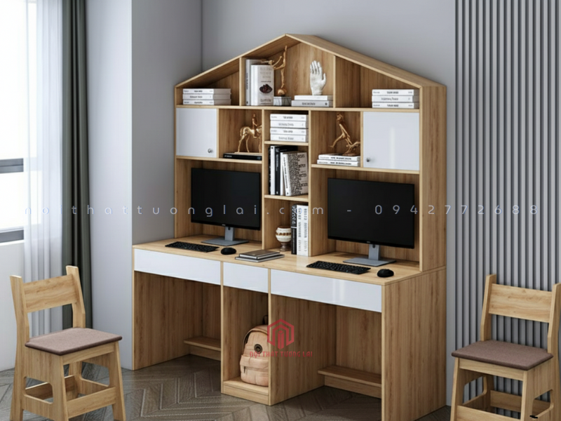 Bàn học đôi kèm giá sách hình ngôi nhà BH6804 là mẫu nội thất học tập đang được nhiều gia đình lựa chọn trong năm 2025 bởi thiết kế tinh tế, đa năng và vô cùng cuốn hút. Sản phẩm nổi bật với phần giá sách cách điệu theo hình mái nhà ấn tượng, vừa tạo điểm nhấn thẩm mỹ, vừa mang lại cảm giác gần gũi, thân thiện đối với trẻ nhỏ. Nhờ cấu trúc bàn đôi rộng rãi, BH6804 cho phép hai bé sử dụng cùng lúc mà không vướng víu, giúp bố mẹ tối ưu diện tích phòng học, phòng ngủ hoặc phòng sinh hoạt chung.