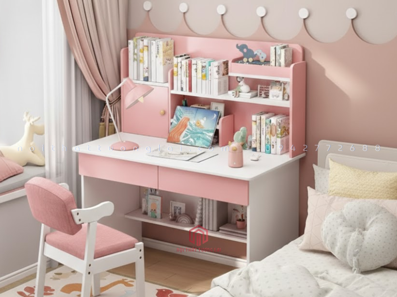 Bàn học đơn BH6867 sở hữu thiết kế nhỏ gọn, đáng yêu, rất phù hợp cho phòng ngủ bé gái. Sản phẩm được làm từ MDF cốt xanh chống ẩm, phủ melamine cao cấp giúp chống trầy xước, dễ vệ sinh và bền đẹp theo thời gian. Bàn tích hợp giá sách mini ngay phía trên, chia ô khoa học giúp bé sắp xếp sách vở, đồ dùng gọn gàng. Gam màu hồng – trắng pastel nhẹ nhàng tạo cảm giác dễ thương, khơi gợi hứng thú học tập cho bé. BH6867 là lựa chọn lý tưởng cho những không gian nhỏ nhưng vẫn yêu cầu tính thẩm mỹ và công năng đầy đủ.