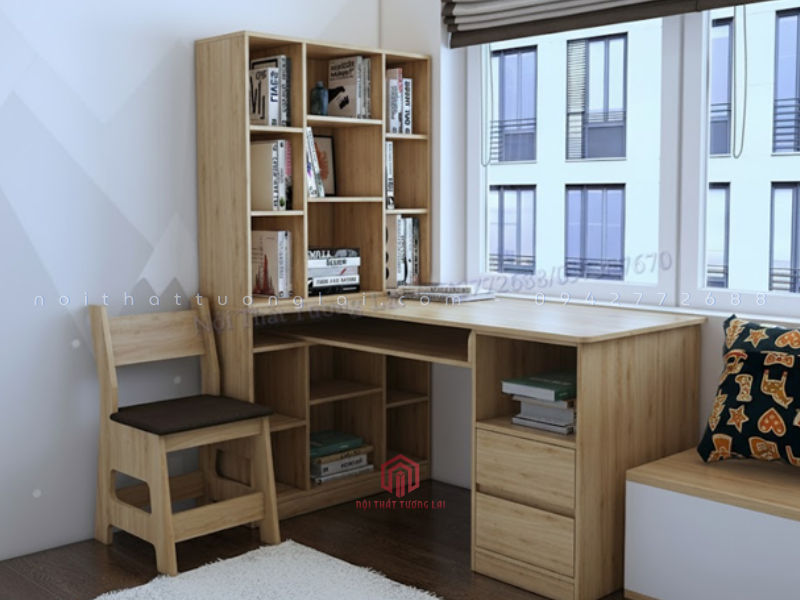 Bàn học góc đẹp có giá sách BH6803 là mẫu bàn học – bàn làm việc tối ưu không gian, phù hợp cho phòng ngủ, phòng học hoặc căn hộ diện tích nhỏ. Thiết kế dạng góc chữ L giúp tận dụng tối đa không gian, tạo nên khu vực học tập khoa học, ngăn nắp và đầy cảm hứng.