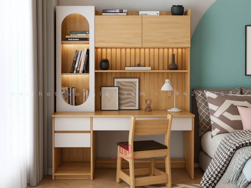 Bàn học sinh BH6806 là mẫu bàn học cao cấp được thiết kế theo phong cách hiện đại, tinh tế, phù hợp cho bé tiểu học đến THCS. Sản phẩm sở hữu tone màu vân gỗ ấm áp kết hợp cùng hệ giá sách liền bàn sang trọng, mang đến không gian học tập khoa học, đẹp mắt và cực kỳ gọn gàng.