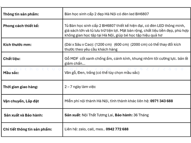 Bàn học BH6807 là mẫu tủ bàn học sinh cấp 2 được thiết kế theo phong cách hiện đại, tích hợp đầy đủ công năng của một chiếc bàn làm việc, tủ sách, và không gian lưu trữ cá nhân. Sản phẩm nổi bật với hệ thống đèn LED 2 màu thông minh, mặt bàn rộng rãi, và chất liệu cao cấp, đảm bảo một môi trường học tập tiện nghi và hiệu quả tại Hà Nội và các tỉnh thành khác.