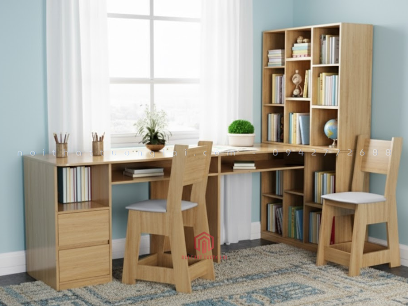 Bàn học góc cho 2 bé BH6814 là mẫu bàn học thông minh được thiết kế tối ưu không gian, phù hợp cho phòng ngủ trẻ em từ 6–15 tuổi. Với bố cục chữ L kết hợp giá sách đứng lớn, sản phẩm giúp hai bé có khu vực học tập riêng tư, ngăn nắp mà vẫn dễ dàng tương tác với nhau. Chất liệu MDF lõi xanh chống ẩm bền đẹp, màu sắc hài hòa, kích thước tiêu chuẩn và công năng thông minh khiến BH6814 trở thành lựa chọn lý tưởng cho gia đình muốn tạo môi trường học tập hiện đại – khoa học cho con.
