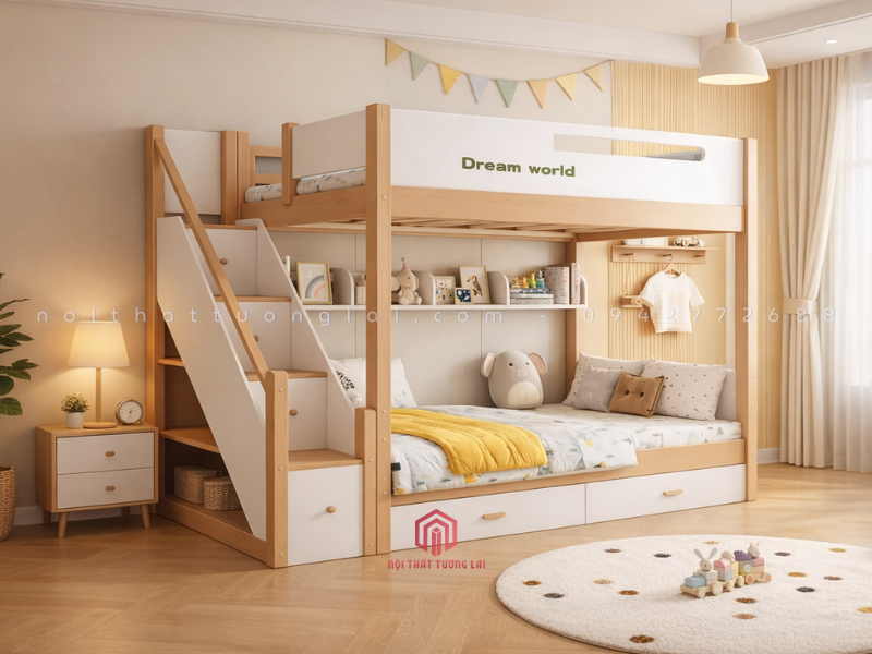 Giường 2 tầng trẻ em 1m2 gỗ tự nhiên đẹp - hiện đại GT6811 chính là câu trả lời hoàn hảo nhất mà thương hiệu Nội Thất Tương Lai mang đến cho gia đình bạn. Không chỉ là một nơi để ngủ, GT6811 là một "người bạn" đồng hành thông minh, cùng con trưởng thành từ những giấc ngủ đầu đời cho đến khi khôn lớn.