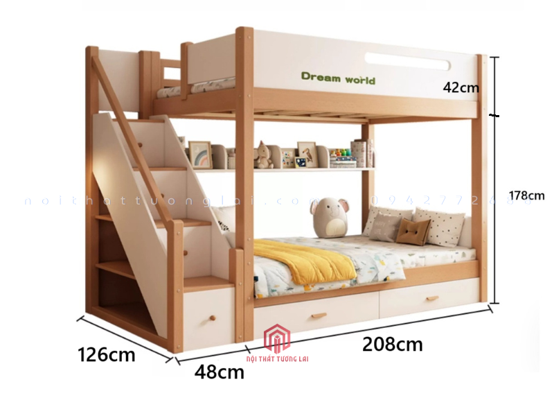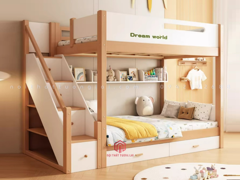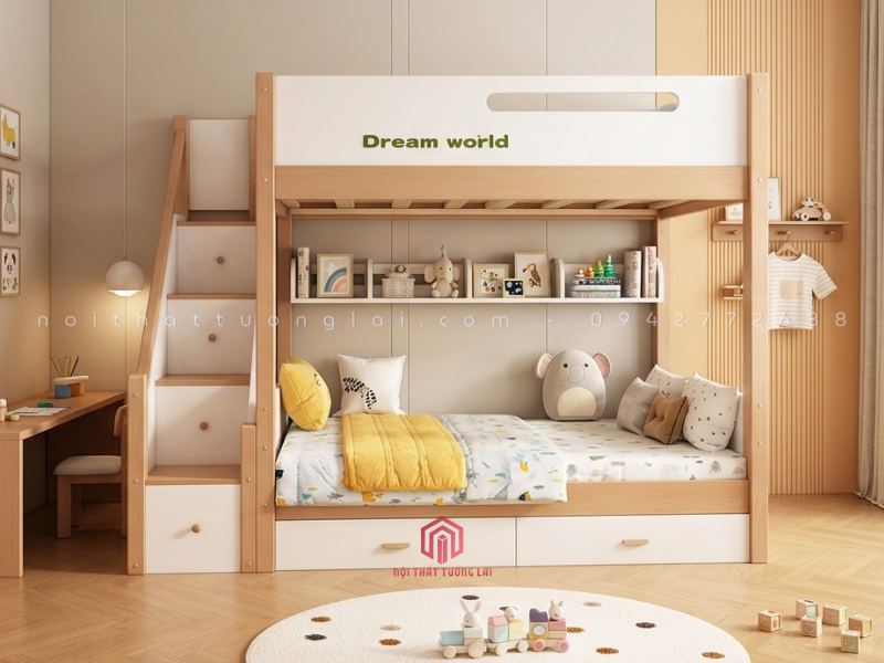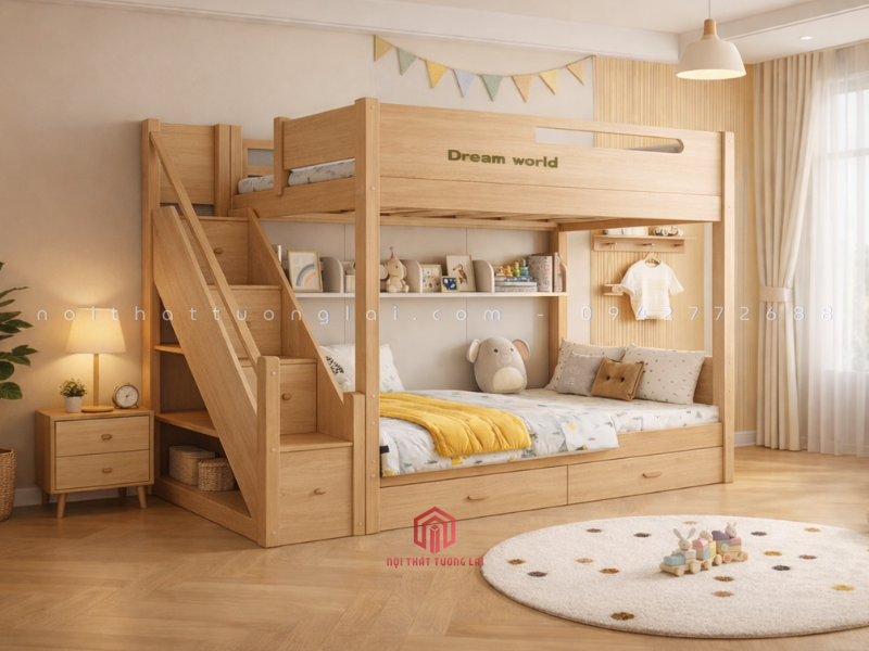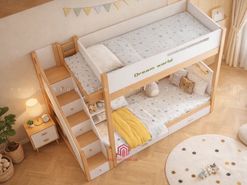 Kích thước linh hoạt: Tầng dưới của giường có 2 lựa chọn bề rộng (1,2m hoặc 1,4m), phù hợp không chỉ cho trẻ em mà còn cho cả ông bà hoặc khách ghé chơi nhà, mang lại sự tiện lợi tối đa.