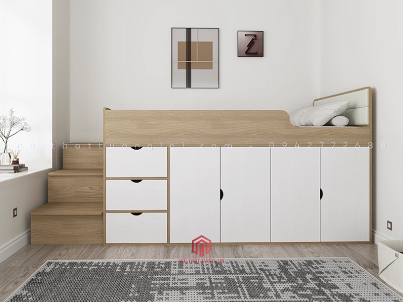 Với thiết kế đa năng, giường ngủ trên cao kết hợp tủ quần áo bên dưới giúp giải phóng không gian phòng ngủ, tạo cảm giác rộng rãi và thoáng mát hơn.