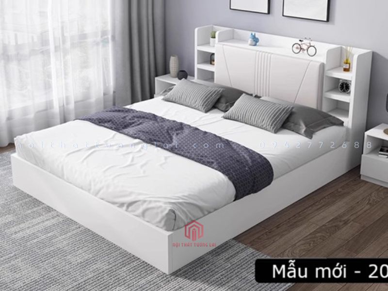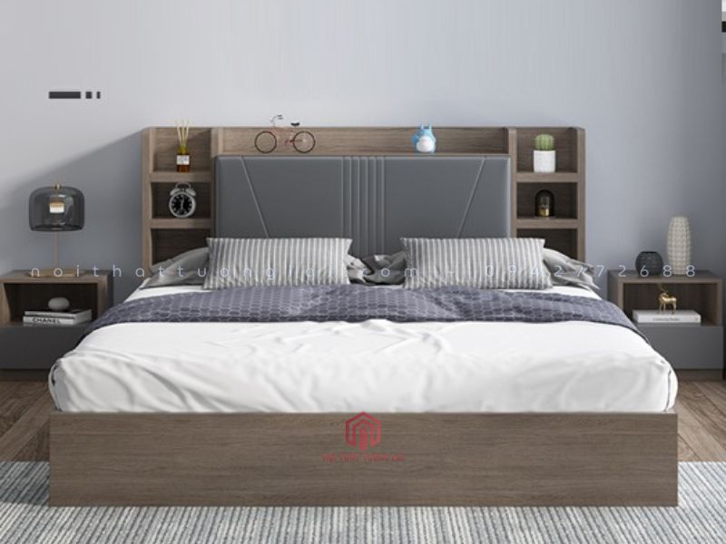 Hệ thống kệ và giá phía trên giường ngủ thông minh đẹp cùng 2 hộc chứa đồ có cánh mở vô cùng tiện ích