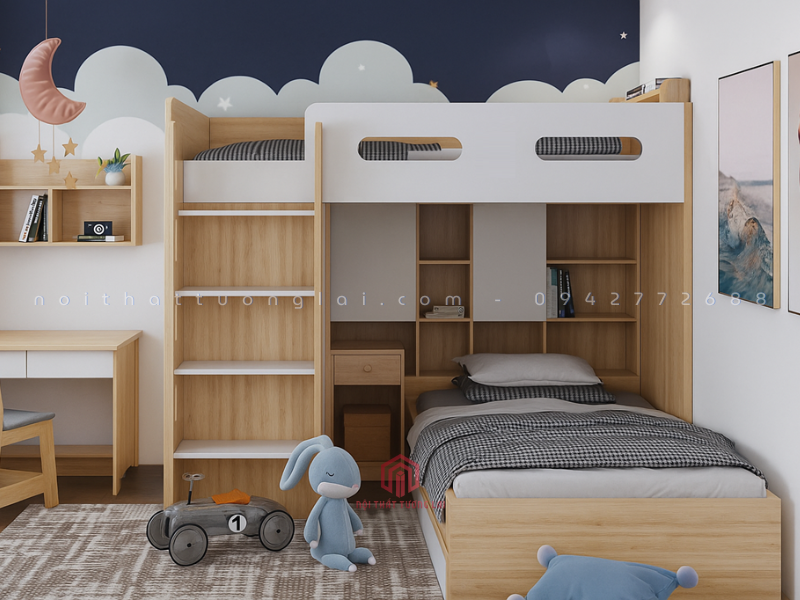 Giường tầng gỗ công nghiệp GT6801 là lựa chọn hoàn hảo cho không gian phòng ngủ hiện đại của bé. Sản phẩm được thiết kế thông minh với hai tầng tiện dụng, kết hợp tủ áo và kệ sách liền giường giúp tiết kiệm diện tích tối đa. Cầu thang giữa chắc chắn, đảm bảo an toàn khi di chuyển. Chất liệu gỗ công nghiệp cao cấp, bề mặt phủ melamine chống trầy xước, chống ẩm mốc và dễ lau chùi. Màu vân gỗ sáng phối trắng tinh tế, tạo cảm giác ấm áp và thanh lịch. GT6801 mang đến không gian nghỉ ngơi – học tập tiện nghi và thẩm mỹ cho trẻ.