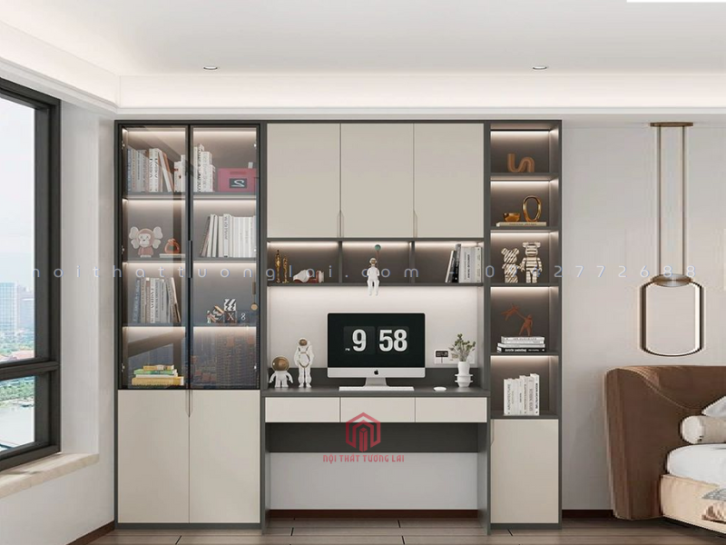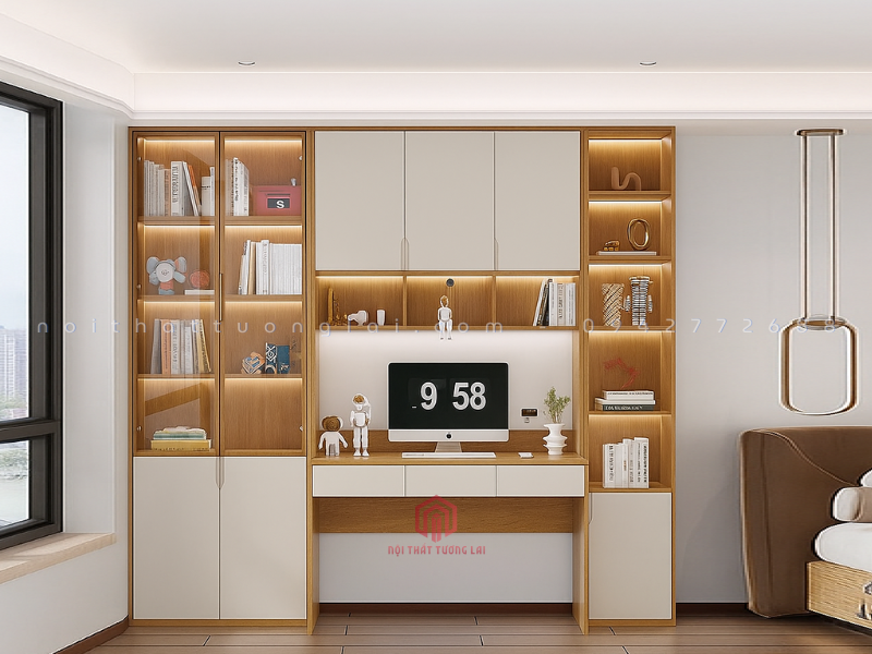 Hệ bàn học liền giá sách BH6872 là mẫu thiết kế cao cấp mang phong cách hiện đại, sang trọng và tinh tế. Sản phẩm được làm từ MDF cốt xanh chống ẩm, phủ melamine cao cấp chống trầy, dễ vệ sinh và bền màu theo thời gian. Thiết kế thông minh với hệ tủ kệ lớn, nhiều ngăn chứa, kết hợp cánh kính khung viền nhôm giúp không gian thêm đẳng cấp và tinh gọn. Bàn học được tích hợp khu vực làm việc tiện dụng, phù hợp cho cả học sinh, sinh viên và người đi làm. BH6872 giúp tối ưu không gian, đồng thời tạo điểm nhấn nổi bật cho phòng học hay phòng ngủ hiện đại.