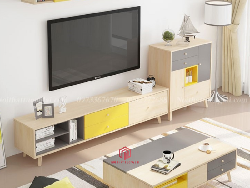 Đây là 1 kiểu phong cách full bao gồm bàn trà, kệ tivi KE6807 và các kệ trang trí đi kèm