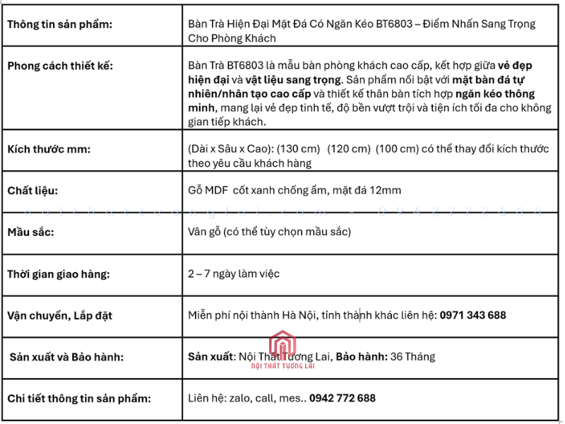 Bàn Trà BT6803 là mẫu bàn phòng khách cao cấp, kết hợp giữa vẻ đẹp hiện đại và vật liệu sang trọng. Sản phẩm nổi bật với mặt bàn đá tự nhiên/nhân tạo cao cấp và thiết kế thân bàn tích hợp ngăn kéo thông minh, mang lại vẻ đẹp tinh tế, độ bền vượt trội và tiện ích tối đa cho không gian tiếp khách.