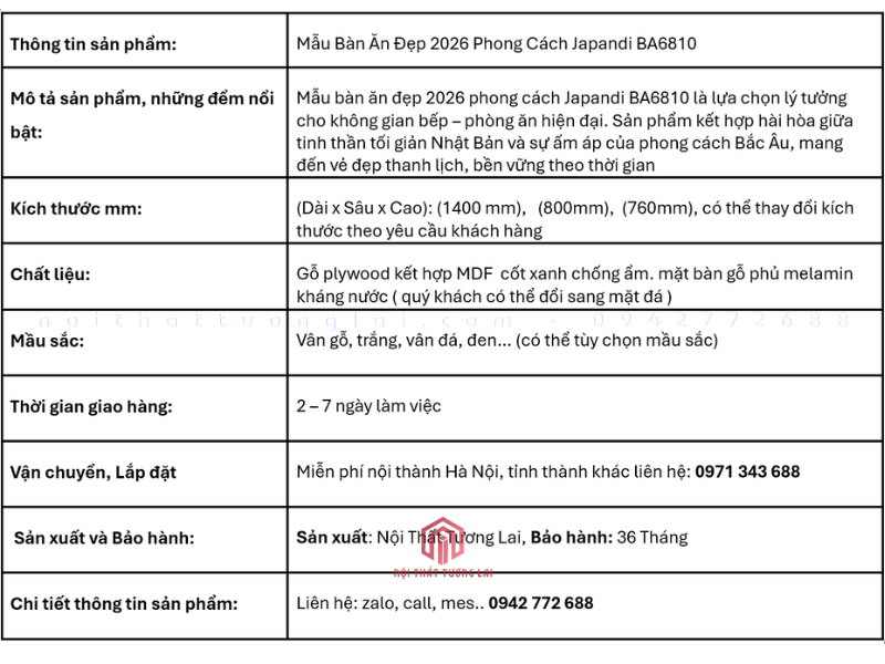 Thông tin chi tết Mẫu bàn ăn đẹp 2026 phong cách Japandi BA6810