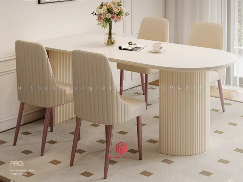 Mẫu bàn ăn đẹp 2026 phong cách Japandi BA6810 màu kem, thiết kế bo góc mềm mại, bố trí trong không gian phòng ăn sang trọng