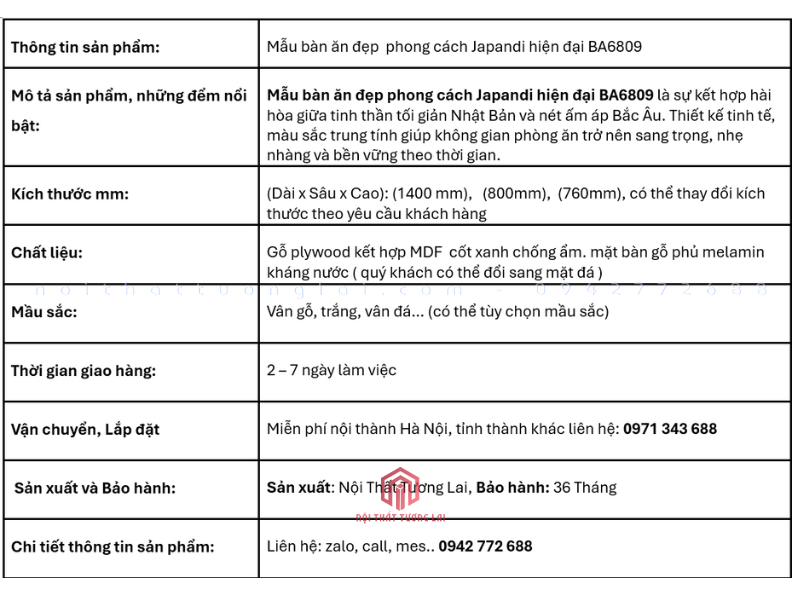 Thông tin chi tết Mẫu bàn ăn đẹp phong cách Japandi hiện đại BA6809