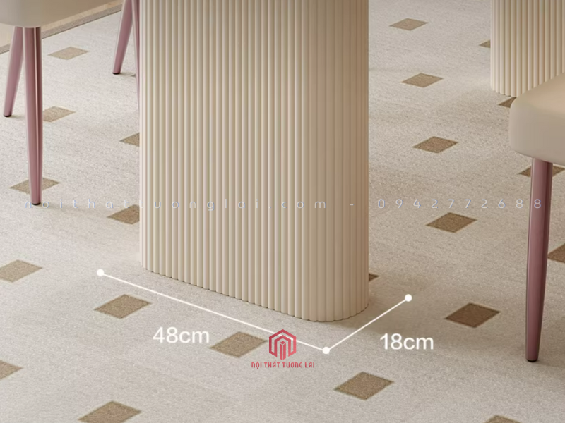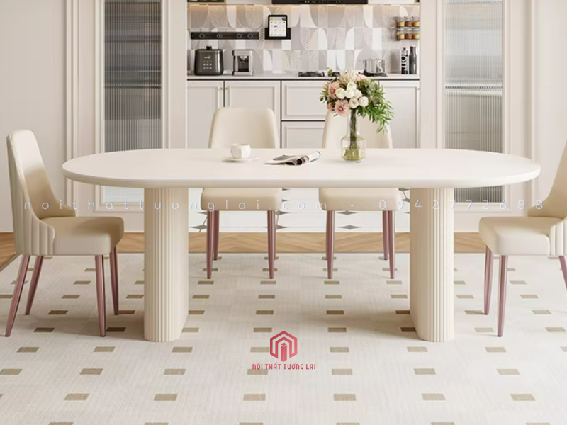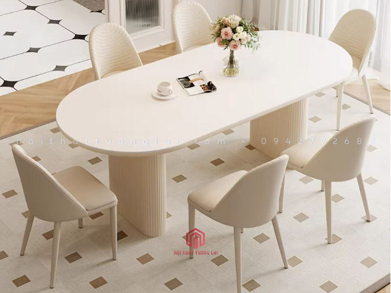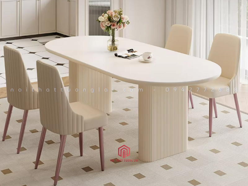 Mặt bàn dạng oval bo cong toàn bộ cạnh giúp tăng tính thẩm mỹ và an toàn khi sử dụng, đặc biệt phù hợp với gia đình có trẻ nhỏ. Kiểu dáng này cũng giúp không gian trở nên mềm mại và hiện đại hơn.