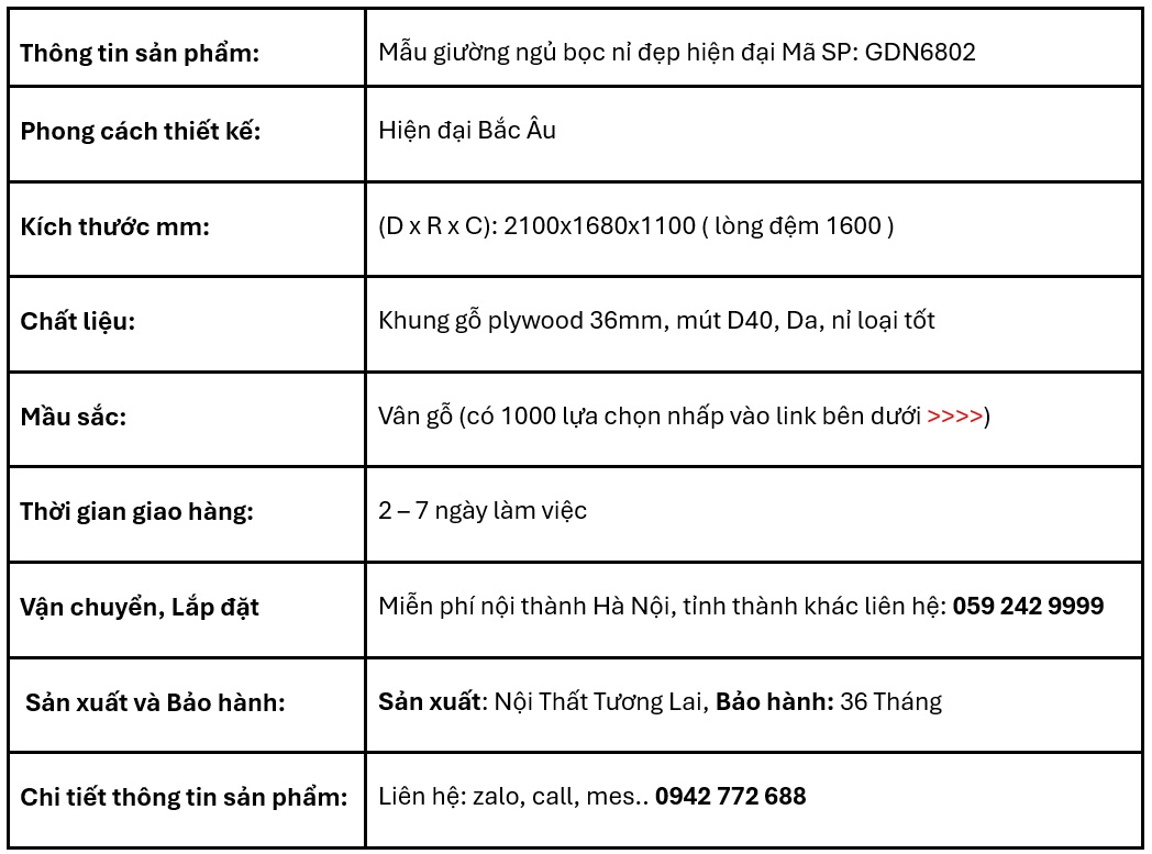 Mẫu giường ngủ bọc nỉ GDN6802 là lựa chọn lý tưởng cho những ai yêu thích phong cách hiện đại và tinh tế. Thiết kế đơn giản nhưng sang trọng, phần đầu giường bo tròn mềm mại bọc nỉ cao cấp, tạo cảm giác êm ái khi tựa lưng. Thân giường được bọc da hoặc vải nỉ tùy chọn, kết hợp cùng khung sắt sơn tĩnh điện chắc chắn, chịu lực tốt. Màu sắc trung tính giúp dễ dàng phối hợp với nhiều không gian nội thất. Đây là dòng sản phẩm phù hợp cho cả căn hộ chung cư, nhà phố hoặc phòng ngủ master. Giường được sản xuất theo tiêu chuẩn cao, bảo hành 36 tháng bởi Nội Thất Tương Lai.