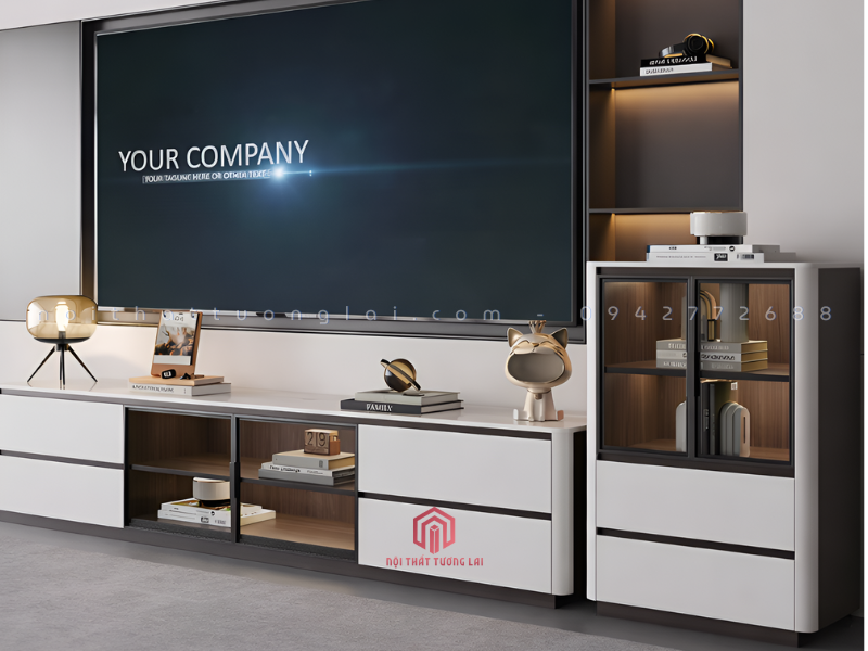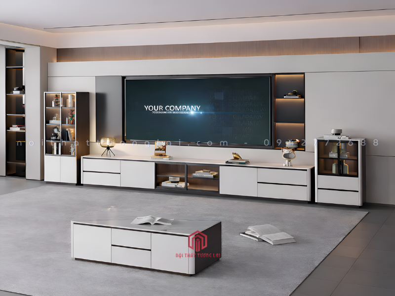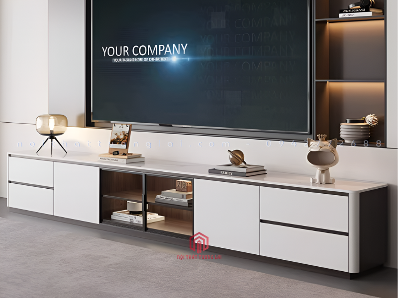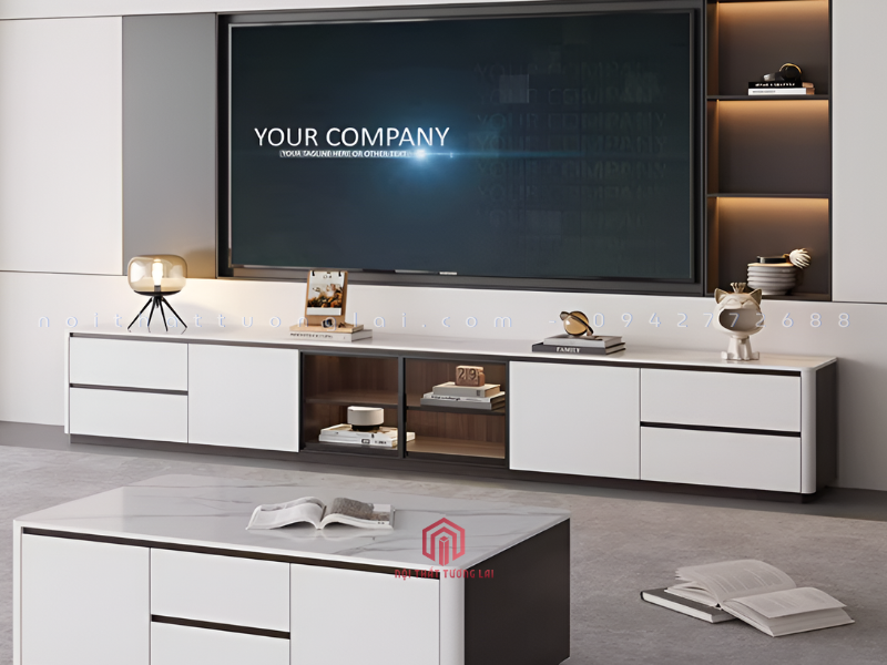 Kiểu dáng: Kệ tivi dài kết hợp tủ trang trí
