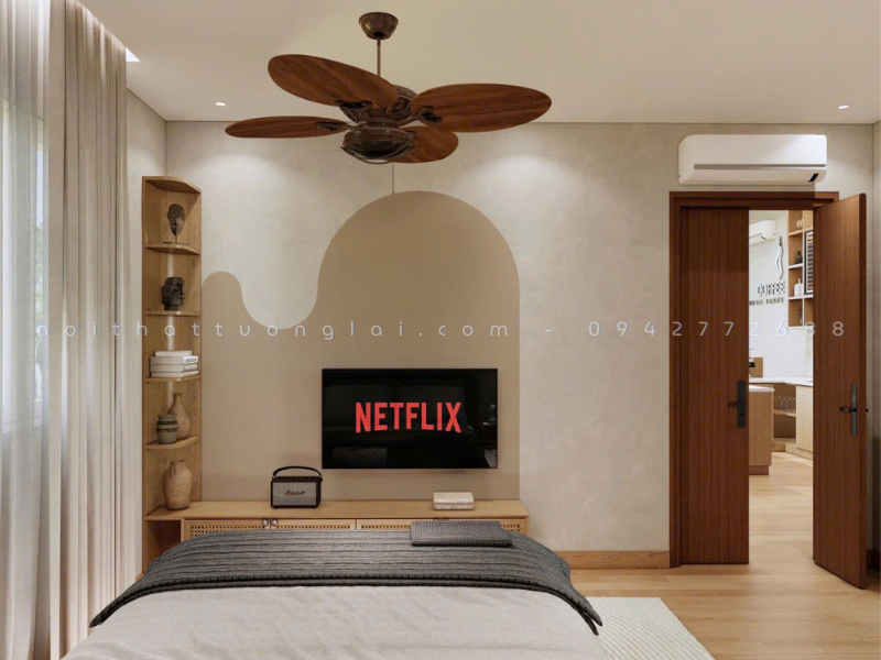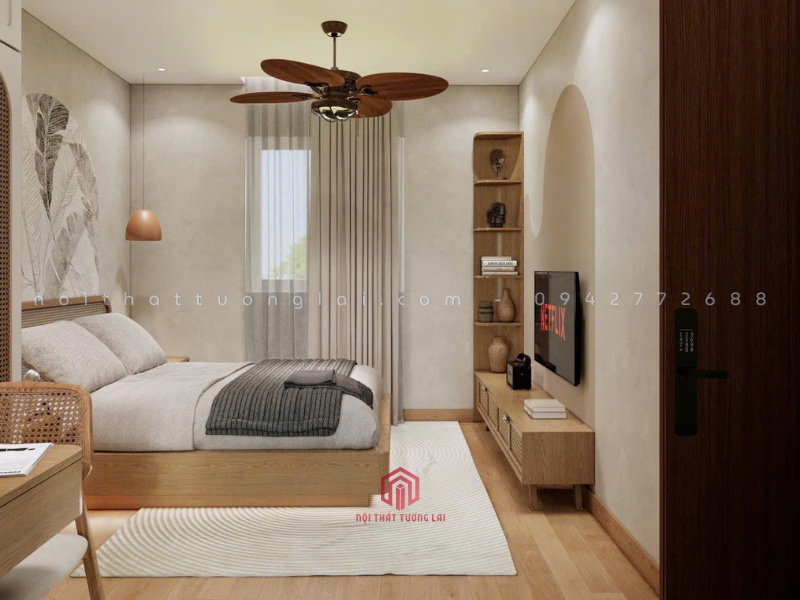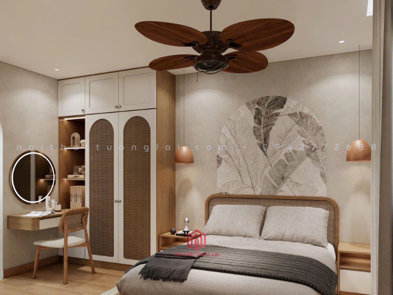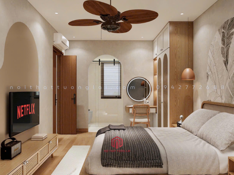 Phòng cưới 16m² PN6805 được thiết kế theo phong cách hiện đại pha nét tự nhiên ấm áp, mang đến không gian lãng mạn và sang trọng cho các cặp đôi mới cưới. Căn phòng sử dụng tone màu be – gỗ chủ đạo kết hợp ánh sáng vàng dịu, tạo sự thư giãn tuyệt đối. Hệ nội thất gồm giường ngủ bo cong mềm mại, tủ quần áo nan mây kịch trần, bàn trang điểm nhỏ gọn và kệ TV tinh giản. Tất cả được tối ưu công năng nhưng vẫn đảm bảo tính thẩm mỹ cao, phù hợp cho phòng cưới diện tích 16m².