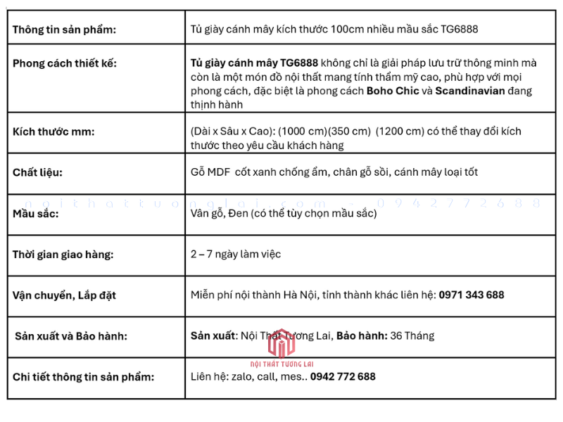 Tủ giày cánh mây TG6888 không chỉ là giải pháp lưu trữ thông minh mà còn là một món đồ nội thất mang tính thẩm mỹ cao, phù hợp với mọi phong cách, đặc biệt là phong cách Boho Chic và Scandinavian đang thịnh hành. Với kích thước lý tưởng 100cm và thiết kế cánh mây đan mắt cáo độc đáo, sản phẩm này chắc chắn sẽ làm bừng sáng không gian sống của bạn.