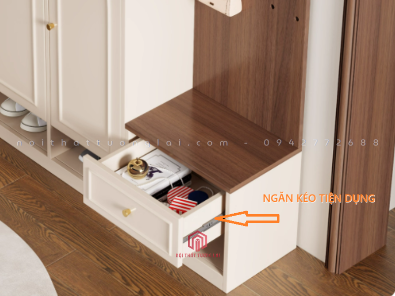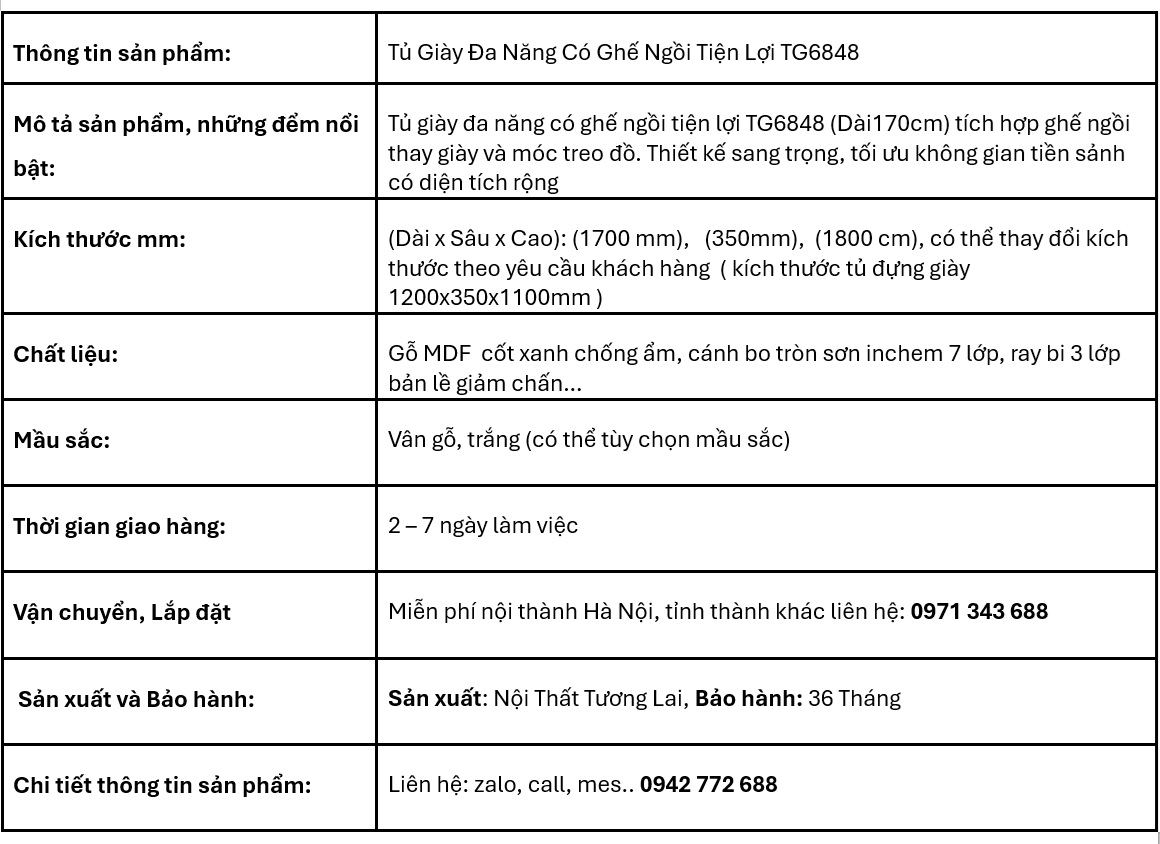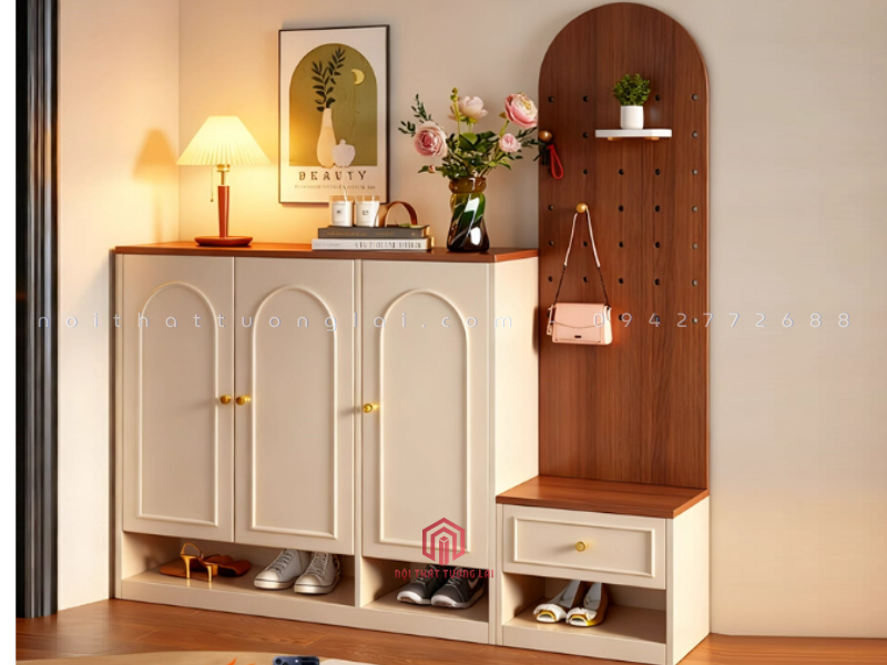 Tủ giày đa năng có ghế ngồi tiện lợi TG6848 là một món đồ nội thất thông minh, tối ưu hóa khu vực sảnh hoặc hành lang của ngôi nhà. Được thiết kế với tính năng đa năng 3 trong 1: lưu trữ giày dép, khu vực thay giày tiện lợi, và nơi treo đồ cá nhân, TG6848 là lựa chọn hoàn hảo cho các gia đình hiện đại.