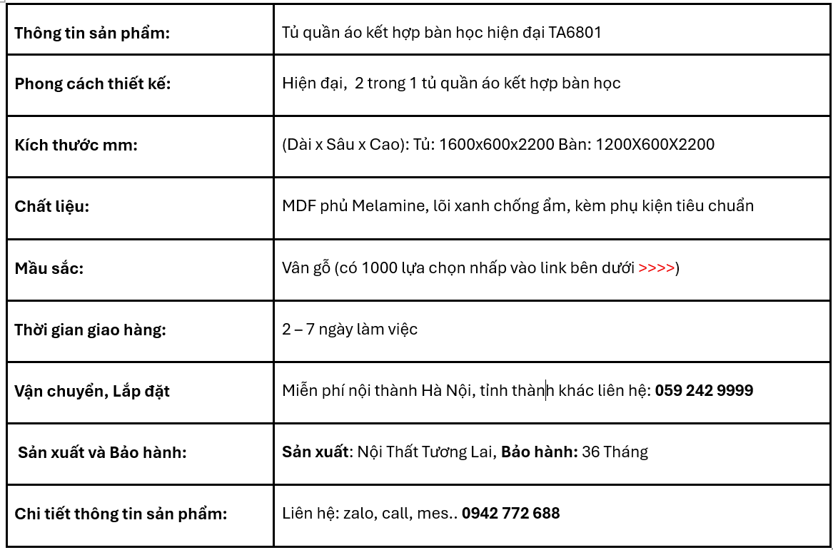 Tủ quần áo kết hợp bàn học hiện đại TA6801 là mẫu nội thất đa năng đang được ưa chuộng nhờ thiết kế tinh tế, tiết kiệm diện tích và công năng vượt trội. Sản phẩm tích hợp giữa tủ quần áo thông minh có bàn học và khu vực làm việc tiện nghi, giúp không gian phòng ngủ trở nên gọn gàng, sang trọng và hiện đại hơn.