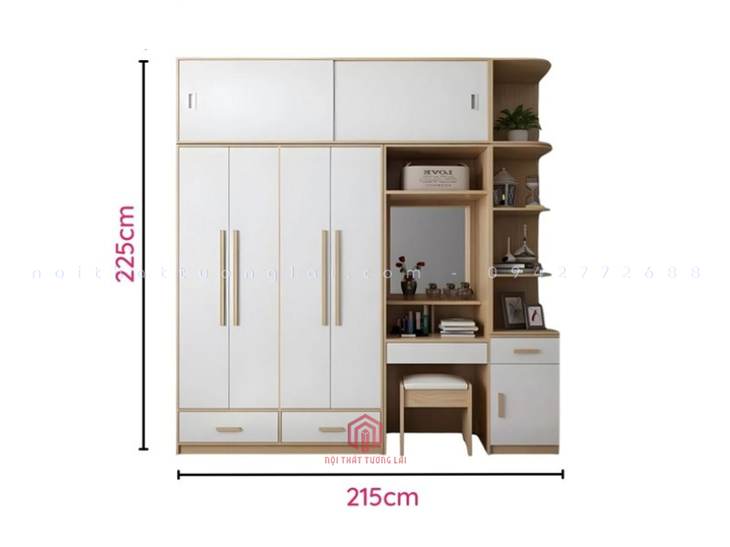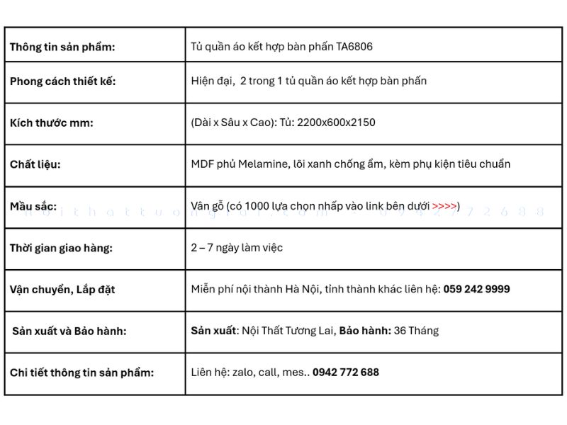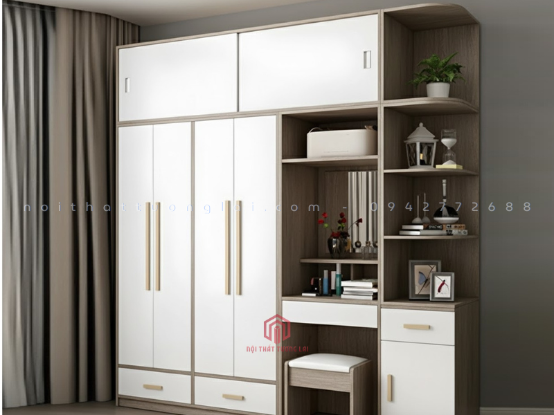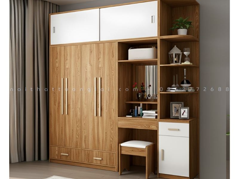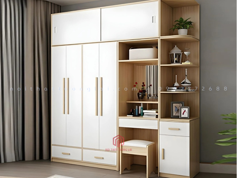 Tủ quần áo kết hợp bàn phấn TA6806 là mẫu nội thất thông minh, thiết kế hiện đại giúp tối ưu không gian phòng ngủ. Sản phẩm tích hợp tủ quần áo, bàn trang điểm và kệ trang trí trong cùng một khối liền mạch. Chất liệu gỗ MDF chống ẩm bền đẹp, màu sắc trang nhã, phù hợp với nhiều phong cách nội thất.